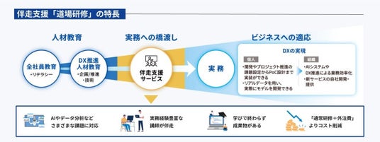AI道場は、実データを活用した課題解決型学習プログラムです。実務経験豊富な講師が、AI開発やデータ分析のPoCまたは実装に約3か月間伴走することで、受講者が学びをビジネスに適用できる力を養います。