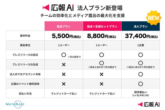 “メディア露出の最大化”に特化したリリース採点・生成機能を月50回利用可能、請求書払いや企業内のアカウント共有にも対応。AI伴走で広報効率を高める