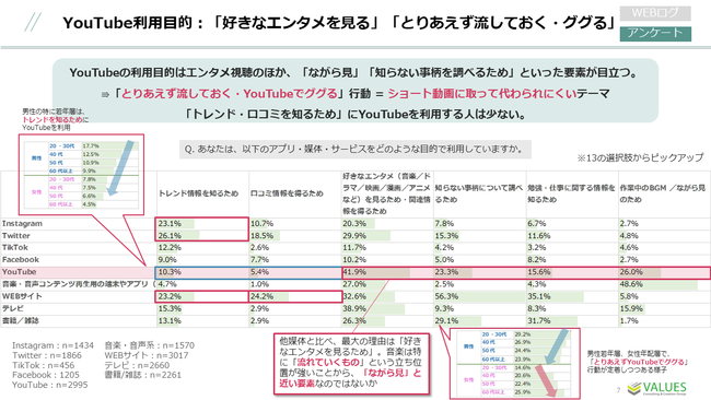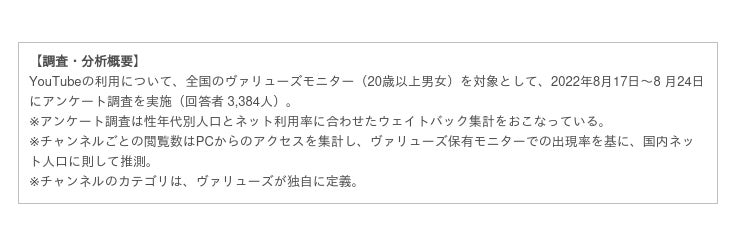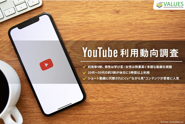 インターネット行動ログ分析によるマーケティング調査・コンサルティングサービスを提供する株式会社ヴァリューズ(本社:東京都港区、代表取締役社長:辻本 秀幸、以下「ヴァリューズ」)は、国内の20歳以上の男女3,384人を対象に、YouTubeの利用に関する消費者アンケート調査を実施しました。またヴァリューズが保有する約25