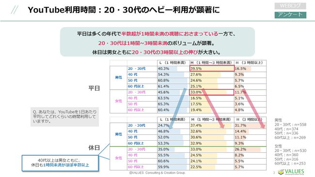 次に休日を見てみると、全体的に1時間以上の利用割合が増加したものの、40代以上は依然として、1時間未満が半数以上となっています。YouTube以外の余暇の過ごし方が確立されている年代といえるかもしれません。反対に、20・30代の3時間以上視聴の割合は休日になって大きく伸びており、YouTubeが生活に定着している様子がうかがえます。