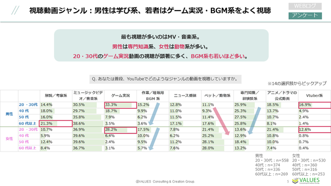 ■男性は学び系の動画を、若者はゲーム実況・BGM系をよく視聴