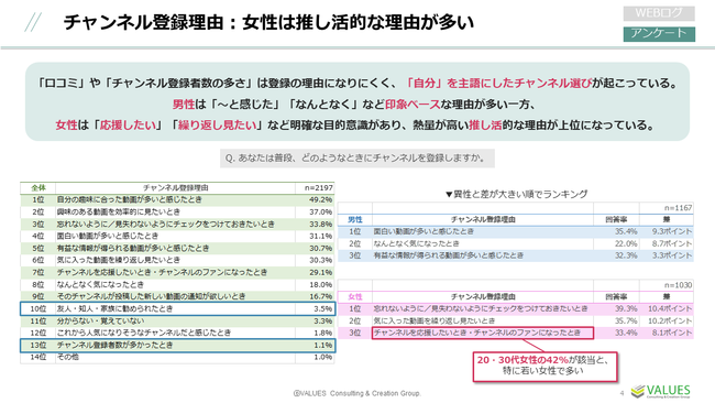 また、男性は女性と、女性は男性と回答率の差が大きい順に登録理由をランキング化すると、男性は「~と感じた」「なんとなく」といった印象ベースな理由が女性に比べて多い一方、女性は「繰り返し見たい」「応援したい」など、目的意識・熱量ともに高いことがうかがえます。女性は「推し活」的な理由が上位といえそうです。特に、20・30代女性の42%が「チャンネルを応援したいとき・チャンネルのファンになったとき」と回答しており、若い女性でより特徴的であることがわかります。