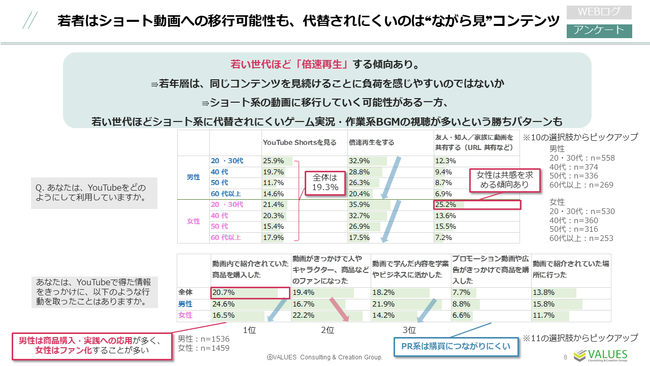 YouTubeに影響された行動については、「動画内で紹介されていた商品を購入した」が約2割となっており、一方でプロモーション目的で作成された動画からは購買につながりにくいことがわかります。また、女性は「動画がきっかけで人やキャラクター、商品などのファンになった」、男性は「動画で学んだ内容を学業やビジネスに活かした」が異性に比べて高く出ており、「男性は学び系の動画をよく視聴し、女性は推し活的な要素が強い」ことと一致する結果となりました。