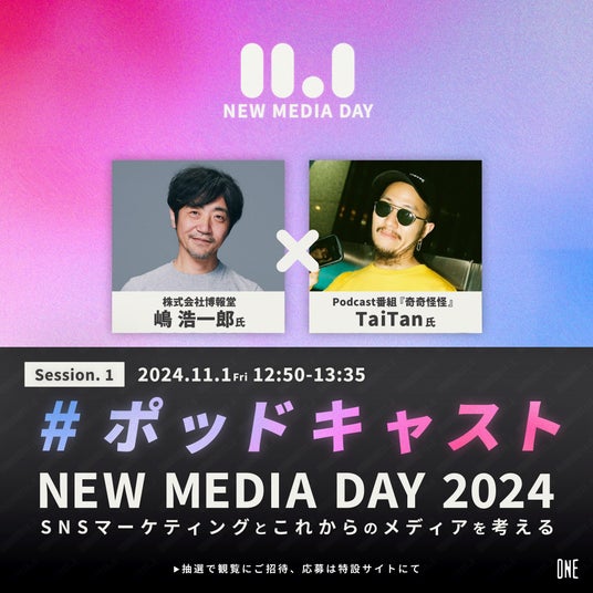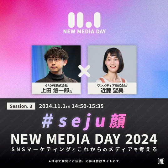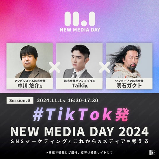 ワンメディア株式会社(本社所在地:東京都渋谷区、代表取締役CEO:明石ガクト、以下「ワンメディア」)は、従来のマスメディアとは異なるデジタル由来のメディア “ニューメディア” を推進するため、ワンメディア創業10周年の節目でもある本年の11月1日に、SNSマーケティングとこれからのメディアを考える完全招待型カンファレンス『NEW MEDIA DAY 2024』をWARP SHINJUKU(ワープ新宿、東京都新宿区)にて実施いたします。カンファレンスの開催に向け、すべてのセッションおよびスピーカーが決定いたしましたので、お知らせいたします。