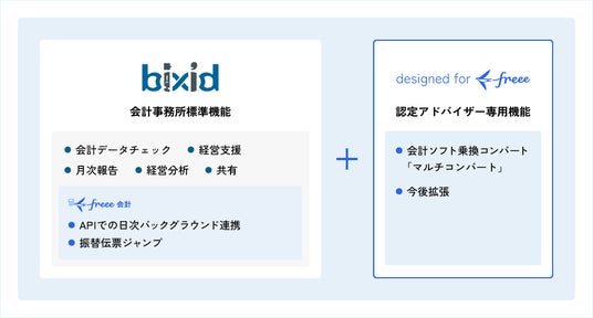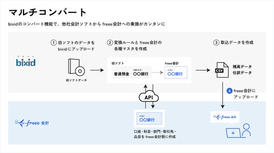 今回freee認定アドバイザー向けにAPI連携の拡張機能として「bixid designed for freee」の提供を開始し、第一弾として、freee会計の利用を開始するユーザー様が、従前から使用している会計ソフトの情報資産を残し、再活用できるシステム「マルチコンバートサービス」の提供をします。