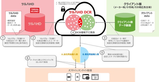 本サービスによって、広告主であるブランドメーカー各社様は自社が保有するデータと、ツルハグループが保有するデータをセキュアな環境で突合をさせ、高度な顧客分析や精度の高い広告配信の実現を目指します。