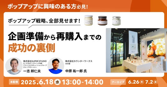 ポップアップストアの出店支援プラットフォーム「SHOPCOUNTER(ショップカウンター)」を運営する株式会社COUNTERWORKS(本社:東京都目黒区、代表取締役CEO:三瓶 直樹、以下カウンターワークス)は、統合コマースプラットフォーム「ecforce」を提供する株式会社SUPER STUDIO(所在地:東京都目黒区、代表取締役CEO:林 紘祐)と共同で、ポップアップストア出店を検討するD2CやECサイトの担当者を対象に、「成長を加速させるオフライン活用戦略」と題した無料のウェビナーを2025年6月18日(水)に開催いたします。