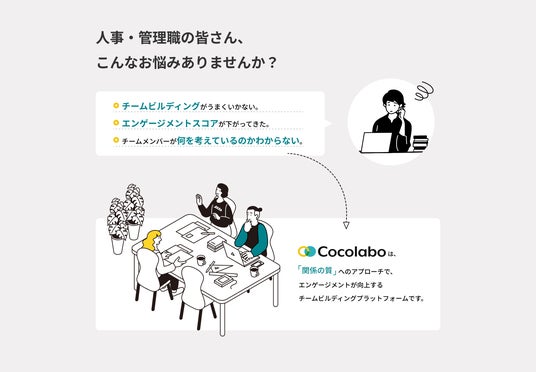 職場やチームの運営に課題を感じている人事部門や組織開発の担当者さま、管理職の皆さまにとって、Cocolaboの活用イメージをより明確に伝えるために、デザインとコンテンツを刷新しました。