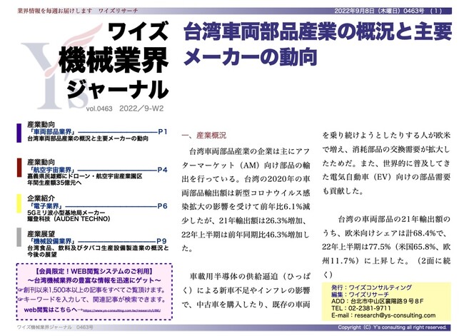 ワイズコンサルティング グループ(本社:中華民国台北市、代表取締役:吉本康志)は台湾機械業界専門誌「ワイズ機械業界ジャーナル」の2022年9月第2週号を発行しました。今週号では、車両部品業界、航空宇宙業界、5Gミリ波小型基地局メーカーの耀登科技(AUDEN TECHNO)と機械設備業界の動向をご紹介します。