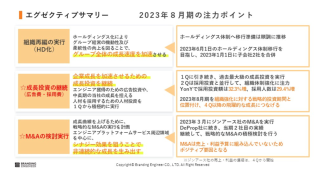 2023年8月期は、組織再編の実行・成長投資の継続・M&Aの検討実行、の3点に注力しております。