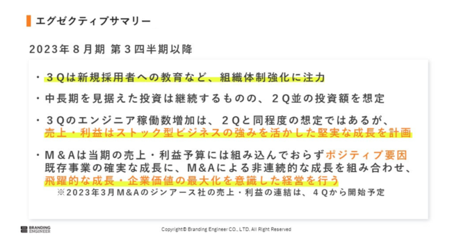 最後に「M&Aの検討実行」は、2023年3月に株式会社ジンアースのM&Aを実行いたしました。当期において、株式会社DePropのM&Aに続き2社目の実績です。「2023年8月期 第3四半期以降について」でも触れた通り、M&Aは売上・利益予算に組み込んでいないため、ポジティブな要因です。