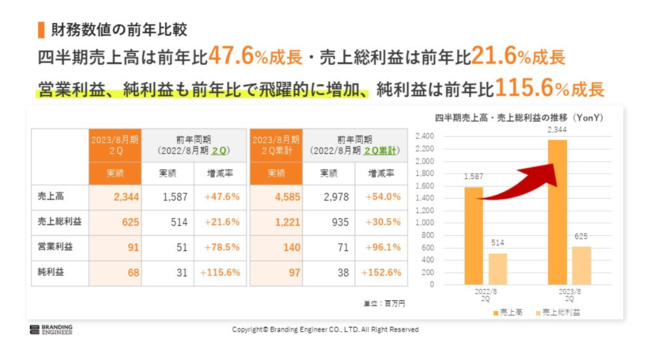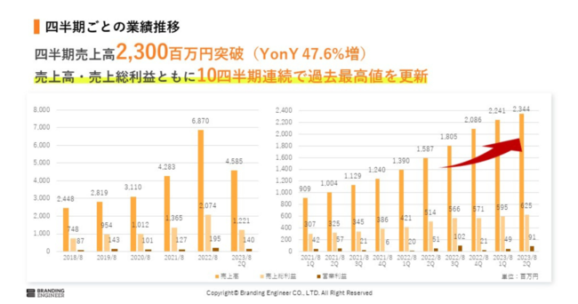 株式会社Branding Engineer(所在地:東京都渋谷区、代表取締役CEO:河端保志、代表取締役COO:高原克弥、証券コード:7352、以下Branding Engineer)は、本日2023年4月14日、2023年8月期 第2四半期決算を発表しました。