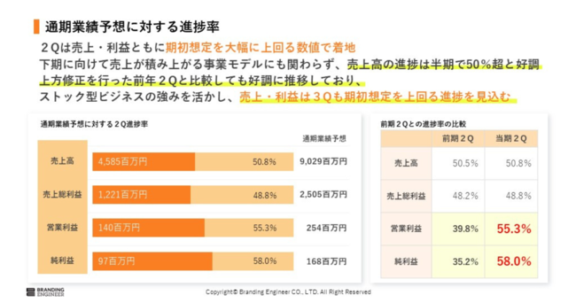 第2四半期の進捗は、売上・利益ともに期初想定を大幅に上回る着地となりました。