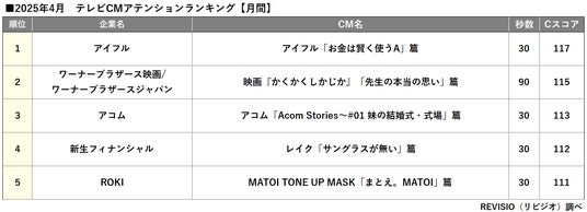 ご家庭に人体認識技術を搭載した機器を設置し、テレビスクリーンの「注視」を測るREVISIO株式会社(旧TVISION INSIGHTS株式会社、所在地 :東京都千代田区、代表取締役社長 郡谷 康士、以下REVISIO)は、 2025年4月に放送されたテレビCMを独自の「アテンション(注視)データ」で分析し、視聴者の視線をくぎづけにしたテレビCMのランキングを公開しました。