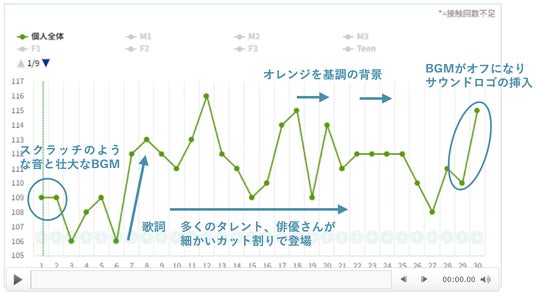 ロック調のBGMが終盤に向けて盛り上がるにつれて注視も上昇。CMの最後に企業ロゴが露出されるシーンは通常注視が落ちやすいが、BGMの勢いに視聴者が画面に惹きつけられたのだろうか。急にオレンジ色の背景に転換したことも視線をくぎづけにする要因となったと思われる。