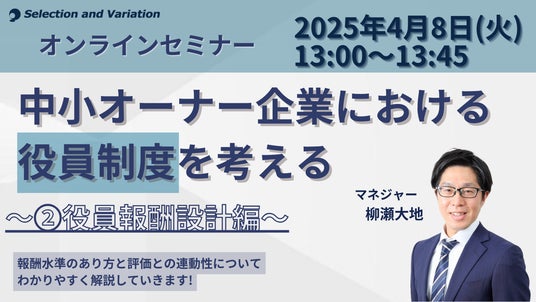https://sele-vari.co.jp/ )は「中小オーナー企業における役員制度を考える ~2.役員報酬設計編~」セミナーを2025年4月8日(火)13:00~13:45に開催することをお知らせいたします。