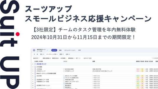 株式会社スーツ(所在地:東京都千代田区、代表取締役社長CEO:小松 裕介)は、チームでかんたん、毎日続けられるプロジェクト・タスク管理ツールの経営支援クラウド「Suit UP」(スーツアップ)において、スモールビジネス応援キャンペーンを実施いたします。