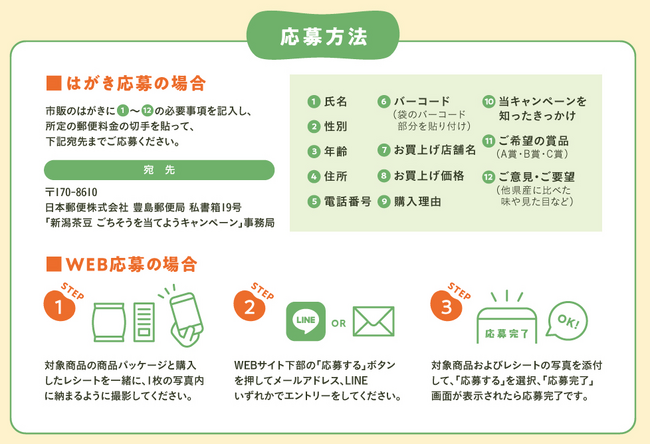 1.氏名 2.性別 3.年齢 4.住所 5.電話番号 6.バーコード(袋のバーコード部分を貼り付け) 7.お買上げ店舗名 8.お買上げ価格 9.購入理由 10.当キャンペーンを知ったきっかけ 11.ご希望の賞品(A賞・B賞・C賞) 12.ご意見・ご要望(他県産に比べた味や見た目など)