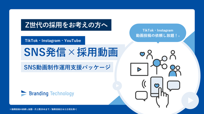 ブランディングテクノロジー株式会社(代表取締役社長:木村 裕紀、本社:東京都渋谷区、証券コード7067、以下当社)は、若手人材の採用に課題を感じている企業様に向け、TikTok・Instagram・YouTubeを活用したSNS動画制作運用支援サービスの提供を開始します。