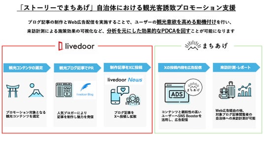 ■「ストーリーでまちあげ」サービス概要 「まちあげ」と「ライブドアブログ」を連携し、ライブドア公式ブロガーが制作する自治体の観光タイアップ記事及び、Xを活用した自治体の観光客誘致プロモーションサービス「ストーリーでまちあげ」を提供いたします。プロモーションから、来訪計測などの効果測定までをトータルにサポートいたします。