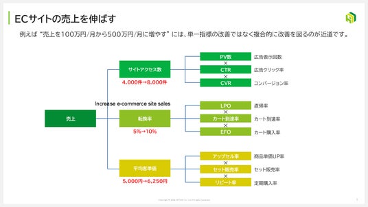 売り上げ拡大に必要な指標や、それらの数値を改善させる分析手法、施策まで詳しく解説しています。