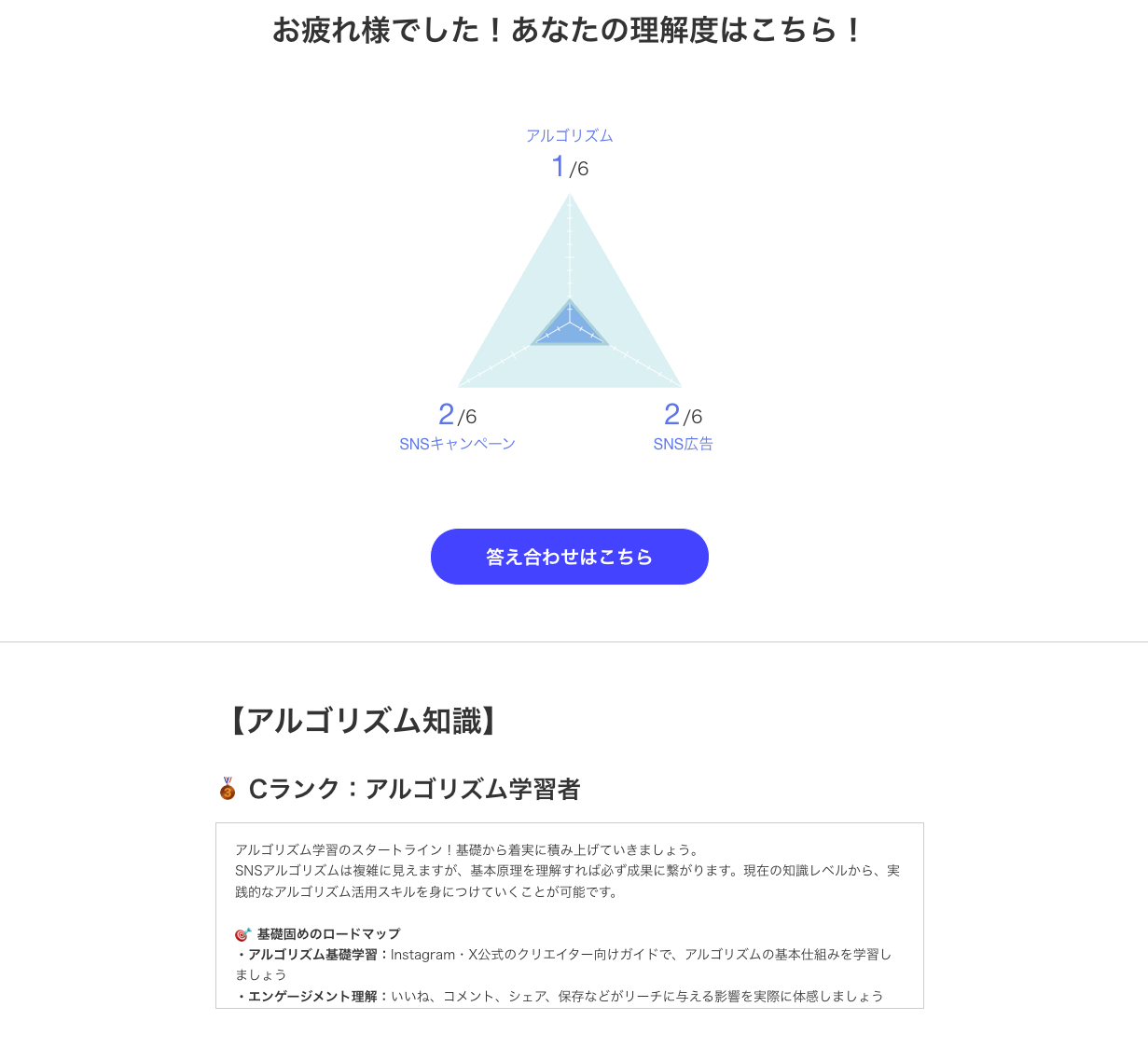 この検定では、あなたの回答から「知っていること」「知らなかったこと」を明確にし、SNS運用における現在地を把握できます。