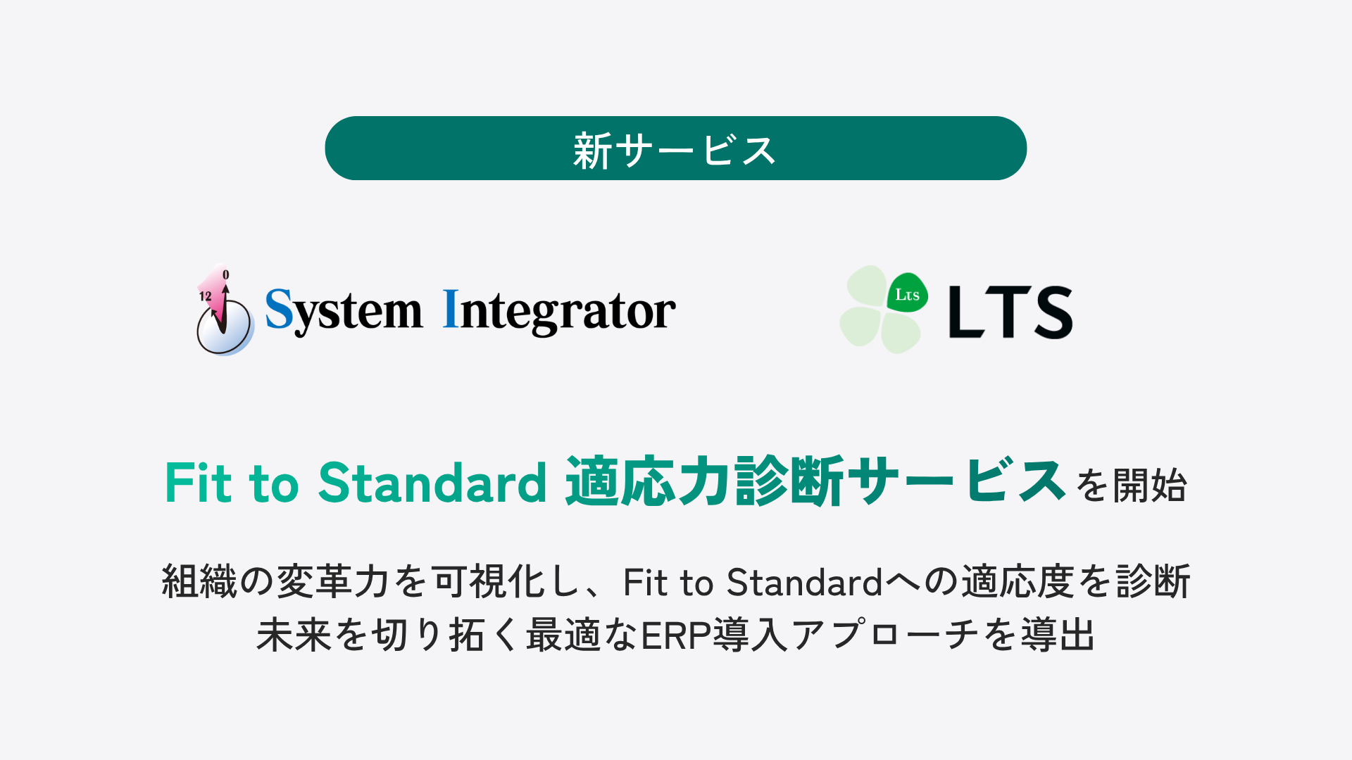 株式会社システムインテグレータ(本社:埼玉県さいたま市、代表取締役社長:引屋敷 智/以下、システムインテグレータ)は、企業変革を支援するコンサルティングと、IT業界の未来を拓くプラットフォームを提供する株式会社エル・ティー・エス(本社:東京都港区、代表取締役 社長執行役員:樺島 弘明/以下、LTS)と共に、組織の変革適応力を可視化し最適なERP導入アプローチを提示する「Fit to Standard 適応力診断サービス」を開始いたします。
