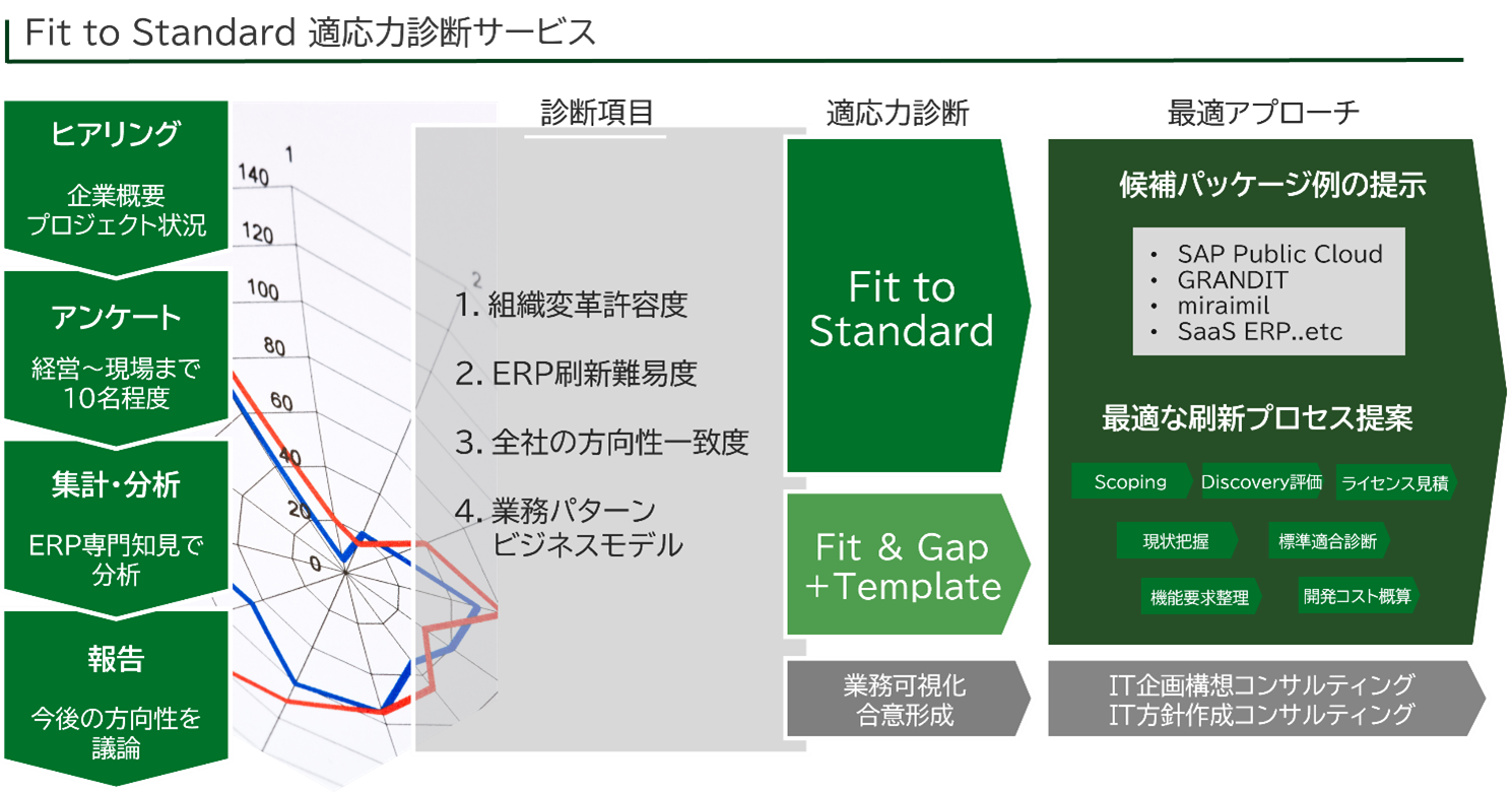 本サービスでは、各ステークホルダーの考え方や課題認識をとりまとめ「Fit to Standardでプロジェクトを推進した場合の課題の有無」、「組織にあったIT導入アプローチ」を診断します。また、パッケージ導入を検討する場合の「候補となりえるパッケージ例」を提示します 。