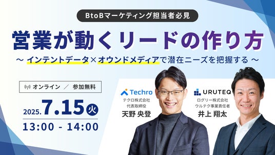 アカウントインテリジェンスツール※1『ウルテク』を提供するログリー株式会社とオウンドメディアやMA/SFAの導入運用支援を通してBtoB企業のWebマーケティングを支援するテクロ株式会社は、BtoB企業のマーケティング責任者/担当者向けに、「営業が動くリードの作り方 ~インテントデータ×オウンドメディアで潜在ニーズを把握する~」というテーマの無料のオンラインウェビナーを開催します。