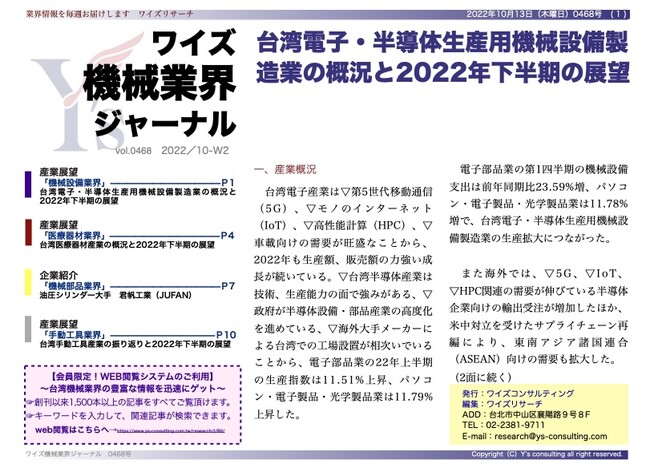 ワイズコンサルティング グループ(本社:中華民国台北市、代表取締役:吉本康志)は台湾機械業界専門誌「ワイズ機械業界ジャーナル」の2022年10月第2週号を発行しました。今週号では、機械設備業界、医療器材業界、油圧シリンダー大手の君帆工業と手動工具業界の動向を紹介します。
