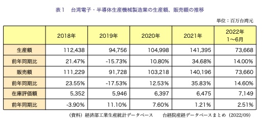 以上、内需拡大と輸出受注の増加により、台湾当産業の22年上半期の生産額は736億6800万台湾元と前年同期比14%増加、販売額は736億6000万元と14.6%増加した。