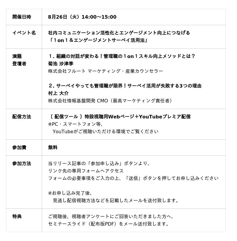 参加申し込み●主催企業情報株式会社フルート「人のパフォーマンスを科学し、その真価を引き出す」個人の幸福の最大化と、社会の発展を両立させる。そのために私たちは、人が多様な価値を発揮できる、新しい「はたらく」のスタンダードを作ることに挑みます。