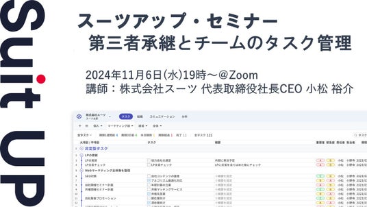 株式会社スーツ(所在地:東京都千代田区、代表取締役社長CEO:小松 裕介)は、2024年11月6日(水)19時から、当社代表の小松が講師を務めるスーツアップ・セミナー「第三者承継とチームのタスク管理」を無料開催します。