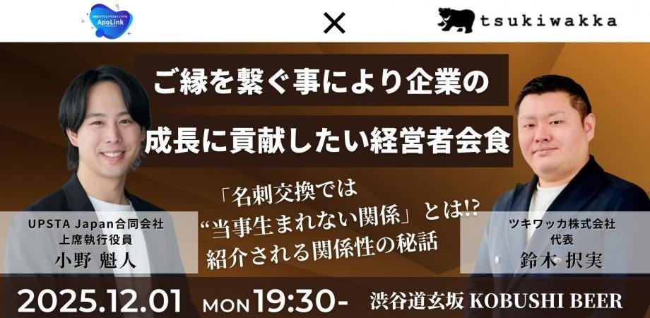 2025年12月1日(月)19:30~ツキワッカの鈴木代表・UPSTA Japanの小野COOとのコラボで、人との“ご縁”を事業の成長エンジンにしたい経営者が集う、少人数交流イベントを開催すると発表した。