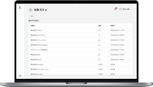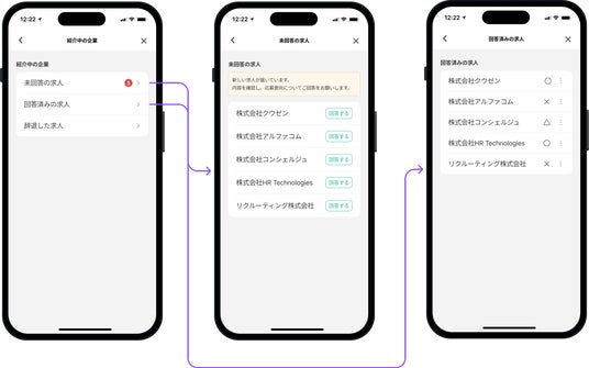 例えばミニアプリマイページでは、それまで会話の中で流れてしまいやすかった過去のご提案求人や面接予定などが一覧化され、任意のタイミングで確認することが可能です。その他ご要望が多い具体的な機能の例としては『求人の意向度確認』などがあります。※下図がUIイメージ
