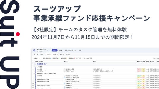株式会社スーツ(所在地:東京都千代田区、代表取締役社長CEO:小松 裕介)は、チームでかんたん、毎日続けられるプロジェクト・タスク管理ツールの経営支援クラウド「Suit UP」(スーツアップ)において、事業承継ファンド応援キャンペーンを実施いたします。