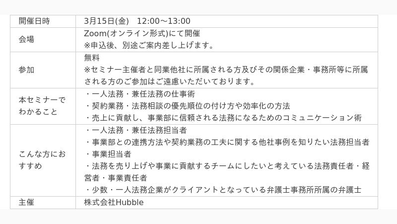 法務と事業部門の協業性を高め、盤石で生産性の高い業務基盤を実現する契約業務クラウドサービス「Hubble(ハブル)」を提供する株式会社Hubble(東京都渋谷区、CEO:早川晋平)は、2024年3月15日(金)12:00-13:00にて、同日に『情報収集力とコミュニケーション力で確実に進める:ひとり法務』(同文館出版)を出版されるLAPRAS株式会社 法務部門責任者・飯田裕子氏をお招きし、「会社からの期待に応える法務の機能とコミュニケーション術~『情報収集力とコミュニケーション力で確実に進める:ひとり法務』出版記念セミナー~」と題したセミナーを開催いたします。本セミナーは事前登録制・オンライン配信です。