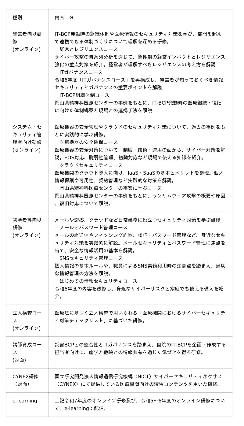 昨年度に引き続き医療機関向けセキュリティ教育支援ポータルサイト(MIST:Medical Information Security Training)を通じて研修の申し込みをはじめ、サイバーセキュリティ教育に活用できるコンテンツ集の掲載など医療機関向けに継続的な教育支援をいたします。医療現場を守るため、そして安心して診療を続けるために、ぜひ本研修へご参加ください。