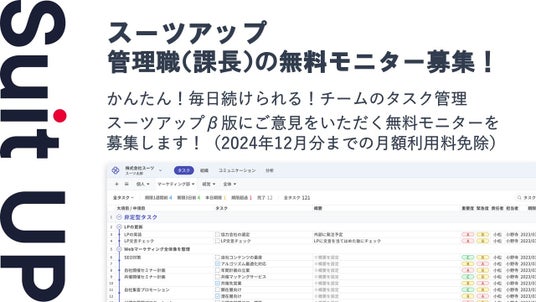 株式会社スーツ(所在地:東京都千代田区、代表取締役社長CEO:小松 裕介)は、チームでかんたん、毎日続けられるプロジェクト・タスク管理ツールの経営支援クラウド「Suit UP」(スーツアップ)の管理職で課長職の方の無料モニターを募集いたします。