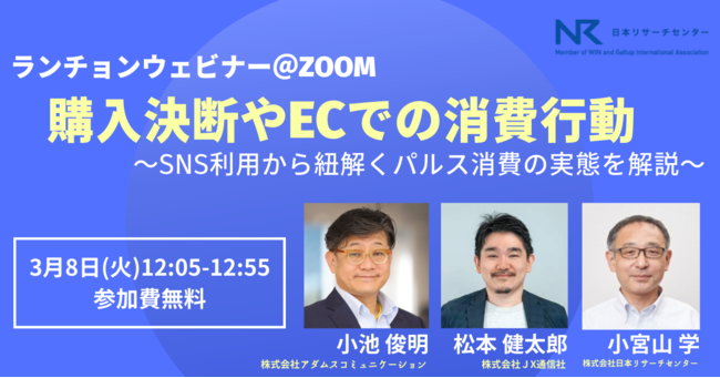 今回のメディア向けランチョンサロンでは、【レギュラーパネラー】 株式会社アダムスコミュニケーション 小池 俊明(こいけ としあき)さん、【レギュラーパネラー】松本 健太郎(まつもと けんたろう)さんとご一緒に「SNS利用から紐解くパルス消費の実態」についてお話します。ウェビナー形式での開催ですので、皆様のご都合のいい環境でのご視聴が可能です。ぜひご参加ください。