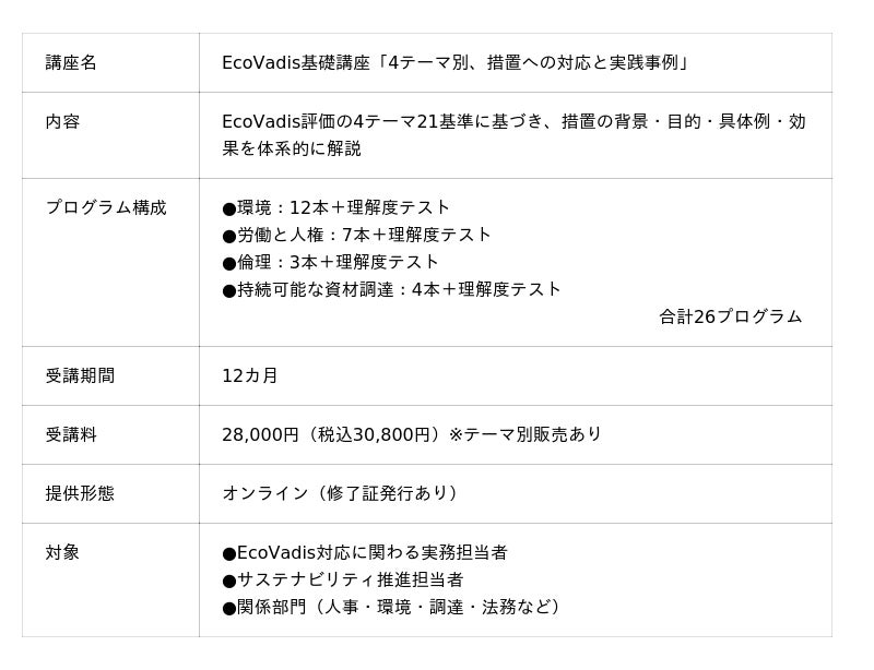詳細を見る本講座は、EcoVadis評価において重要とされる7つのマネジメント指標のうち「措置」に焦点を当て、企業が評価対応を進めるうえで理解すべき、基礎的な背景と目的、措置の具体例、実施による効果を体系的に学べるプログラムです。