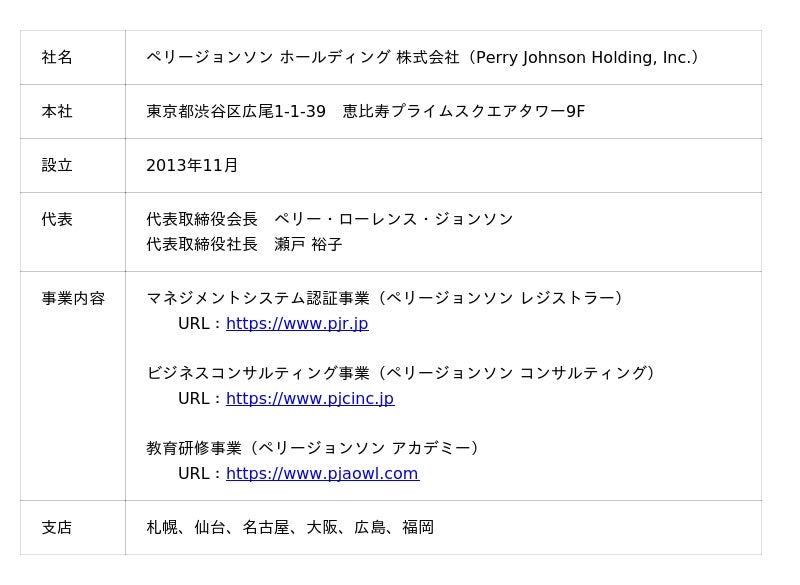 ● ペリージョンソン ホールディング 株式会社ペリー・ローレンス・ジョンソンが米国ミシガン州デトロイト近郊で設立した統計的手法のコンサルティング会社を前身として、1995年に日本に進出したペリージョンソン コンサルティングと、マネジメントシステムの第三者認証機関ペリージョンソン レジストラーが、2013年11月に合併してペリージョンソン ホールディング 株式会社を設立しました。