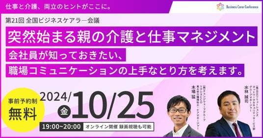 株式会社チェンジウェーブグループ(本社:東京都港区、代表取締役社長:佐々木裕子)は、2024年10月25日(金)に、オンラインセミナー『全国ビジネスケアラー会議 仕事と介護、両立のヒントがここに。』を開催致します。