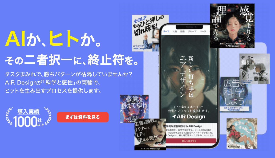 AIR Designは、AIとデータを活用してWeb広告のクリエイティブ制作・改善を行うサービスです。プランナーやデザイナーなど5名のプロチームがクライアントに伴走し、売上や利益につながる本質的な改善を実現します。