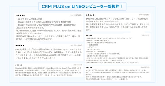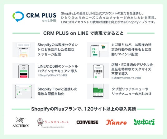 ◆Shopifyアプリ「CRM PLUS on LINE」についてCRM PLUS on LINEは、Shopify上の会員とLINE公式アカウントの友だちを連携し、ひとりひとりのニーズに合ったメッセージの出しわけや、LINE公式アカウントを通じた便利な購入導線を実現するShopifyアプリです。LINEログインなど6種のソーシャルログインやLINEミニアプリ(会員証)も導入可能。初期設定の無料サポートも行なっています。