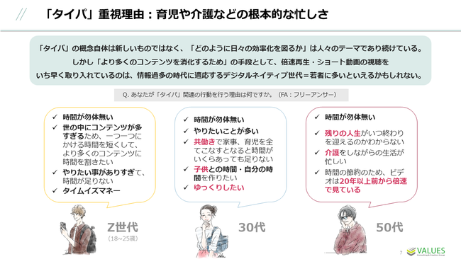 最後に、「タイパ」関連の行動をとる理由について、フリーアンサー形式でたずねました。Z世代(今回は18~25歳で集計)、30代、50代でそれぞれ回答をまとめると、「時間が勿体ない」「より多くのコンテンツを視聴したい」という回答は、いずれの年代も共通して見られました。