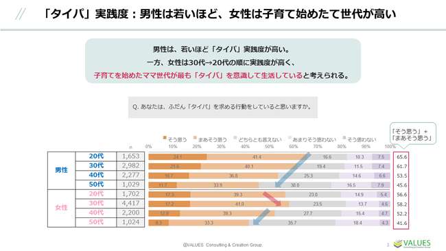 同じく回答者全体に、普段から「タイパ」を求める行動をしているかたずねたところ、男性は認知度と同様に若い世代ほど実践度が高い一方で、女性の実践度は30代(58.2%)、20代(56.6%)、40代(52.2%)の順となり、「30代」がよりタイパ行動をとっているという特徴が見られました。30代女性は手がかかる小さな子供の育児を抱えている人が多く、より「タイパ」を意識した生活を送っていると推測されます。
