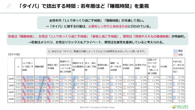 このように「タイパ」を意識して行動する目的を探るため、「タイパ」関連の行動によってどのような時間を捻出したいかをたずねました。全世代で共通して高いのは、「1人でゆっくり過ごす時間」と「睡眠時間」です。心身の休養のために、「タイパ」が意識されていることがわかります。