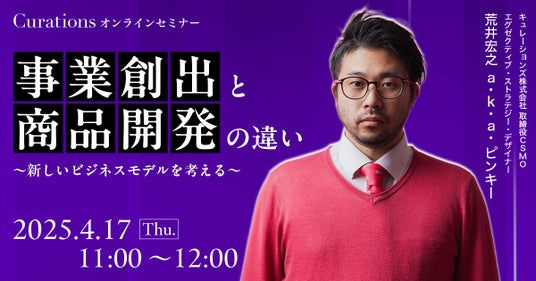顧客企業のビジネス変革を成功に導くキュレーションズ株式会社(本社:東京都渋谷区、代表取締役社長:根本隆之、以下当社)は、『事業創出と商品開発の違い~新しいビジネスモデルを考える~』を2025年4月17日(木)に開催いたします