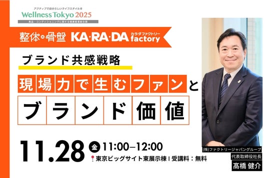 整体×骨盤サロン「カ・ラ・ダ ファクトリー」(以下 カラダファクトリー)を展開する株式会社ファクトリージャパングループ(本社:東京都千代田区、代表取締役社長:高橋 健介、以下 ファクトリージャパン)は、心と体の健康づくりに関する日本最大級の展示会「Wellness Tokyo2025」において、「現場力で生むファンとブランド価値 ~整体×骨盤 カラダファクトリーのブランド共感戦略~」セミナーを2025年11月28日(金)に開催いたします。